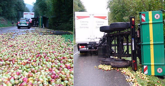 Anhänger mit Äpfeln umgekippt - Asphalt statt Mostpresse (Fotos: Hubert Richter)(hr) Eine ganze Ladung Äpfel verlor ein Lastwagen aus dem Kreis Darmstadt heute Nachmittag auf der B 45 zwischen Gammelsbach und Eberbach. Der mit dem Obst beladene Anhänger war auf gerader Strecke in Fahrtrichtung Eberbach ins Schlingern geraten und schließlich umgekippt.