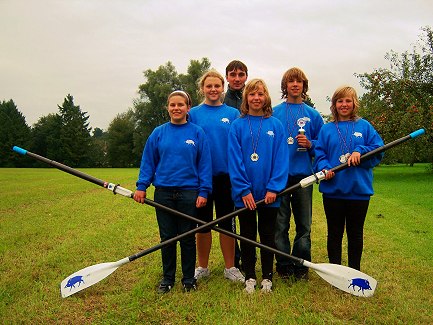 Herbstregatta in Bad Waldsee mit glänzendem Ergebnis V.l.: Anna Hufnagel, Sofie Weber, Trainer Patrick Schölch, Laura Kropmaier, Jannis Scheuenpflug, Carolin Kropmaier. (Foto: privat)(ag) (ewa) Die Sommerpause hat der jungen RGE-Rennmannschaft wohl nicht geschadet. - Bei der ersten Herbstregatta auf dem idyllisch gelegenen Stadtsee in Bad Waldsee, der höchstgelegenen Regattastrecke Deutschlands, konnten sie vergangenes Wochenende mit fünf Siegen und zwei zweiten Plätzen eindrucksvoll ihr Leistungsvermögen unter Beweis stellen.
