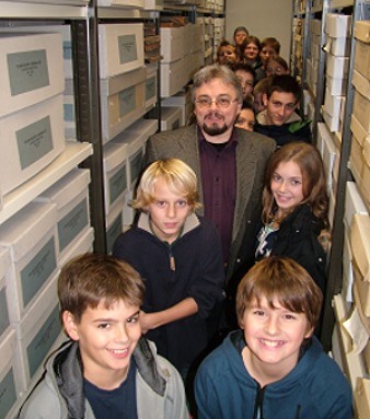 Ein Haus voller Vergangenheit Stadtarchivar Dr. Rüdiger Lenz mit HSG Schülern in den Räumen des Archivs. (Foto: Archiv)(bro) (drl) Am 23. September 1988 wurde das innerhalb von zwei Jahren im Stadtteil Pleutersbach neu erbaute Stadtarchiv Eberbach mit einem Festakt von Bürgermeister Horst Schlesinger feierlich eingeweiht.