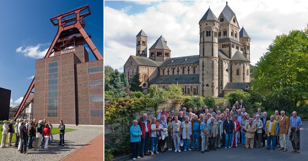 Familienausflug ins Ruhrgebiet Links: Ein Teil der MGV-Reisegruppe bei der Führung durch das UNESCO-Weltkulturerbe "Zeche Zollverein". Rechts: Auf der Rückreise statteten die Sänger und ihre Frauen noch der Benediktinerabtei Maria Laach einen Besuch ab. (Fotos: privat)(bro) (ah) Den "Ruhrpott" hatte sich der MGV Liederkranz in diesem Jahr als Ziel für seinen Familienausflug ausgesucht – Besuch von "Veltins-Arena" und "Zeche Zollverein".