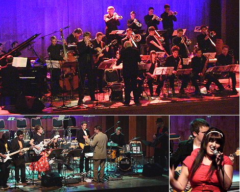 Als Talentschmiede die erste Adresse im Land Das Landes-Jugendjazzorchester begeisterte beim Mosca-Kult. Unten die Gitarrenband der Musikschule und Sängerin Marina Galm. (Fotos: Hubert Richter)(hr) (ra) Erfreulich viele Kinder und Jugendliche erlebten am Sonntag das Gastspiel des Jugendjazzorchesters Baden Württemberg. Die Stadthalle erbebte am dritten Abend der "Mosca-Kult"-Reihe unter den Klängen einer Bigband, an der selbst Schöpfer des Genres, wie Fletcher Henderson oder Benny Goodman, ihre Freude gehabt hätten.