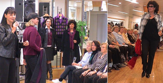 Aus der Kollektion von Gerry Weber präsentierten sie den zahlreich erschienenen meist weiblichen Gästen Modelle in den neuen Farben Beere und Lila, aber auch die "Klassiker" Schwarz, Weiß und Rot kamen nicht zu kurz. Ebenso sind nach wie vor Karos bei Jacken und Hosen im Trend.