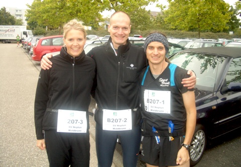 (hof) (mz) Am vergangenen Sonntag nahmen drei Ausdauersportler des SV Neptun Waldbrunn bei angenehmem Laufwetter als Staffel beim Karlsruher Baden-Marathon teil. Obwohl fast 10.000 Starter in den verschiedensten Wertungen an dem Lauf teilnahmen, war die Organisation vorbildlich. Die Strecke wurde für die Staffeln in drei unterschiedlich große Teile aufgeteilt: Manuel Zin lief die erste Hälfte des Marathons (21,1 km) in der Zeit von 1:34:25 Std. Ralf Hilbers lief die nächsten 15 km und seine Schwägerin Karola Hilbers die letzten 6,1 km ins Ziel. Zusammen benötigten die drei für die Marathonstrecke 3:26:18 Std. und belegten damit einen hervorragenden 57. Gesamtplatz bei den Staffeln. Es waren insgesamt 360 Staffeln angetreten, davon waren 184 Mixed-Staffeln. In dieser Wertung belegte die Waldbrunner Staffel den 17. Platz.