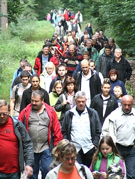 Betriebsausflug einmal anders (Foto: privat)(bro) (aw) Am Samstag, 20. September, lud Johann Philipp Dilo die Belegschaft der OSKAR DILO Maschinenfabrik KG zum ersten Betriebswandertag ein. Früh am Morgen trafen sich ca. 120 Mitarbeiter und Familienangehörige am Grünen Baum in Eberbach, um sich unter der Leitung des Odenwaldklubs auf eine Wanderung über den Breitenstein und die Teufelskanzel nach Zwingenberg zur Wolfsschlucht zu begeben. Die Strecke von 13 km war so gewählt, dass sie für jung und alt gut zu bewältigen war. Ganze Familien mit zum Teil noch recht kleinen Kindern, wie auch ältere Mitarbeiter genossen die Wanderung bei idealem Wanderwetter. Die Organisation hatte aber auch an die Kollegen gedacht, die weniger gut zu Fuß sind und bot die Möglichkeit an, in Lindach dazu zu stoßen.