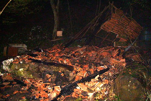 Schwierige Löscharbeiten am Ohrsberg (Foto: Hubert Richter)(cr) Am Nordhang des Ohrsbergs ist gestern gegen Mitternacht eine alte Gartenhütte komplett abgebrannt. Sie befand sich auf einem nicht mehr bewirtschafteten und verwilderten Grundstück.