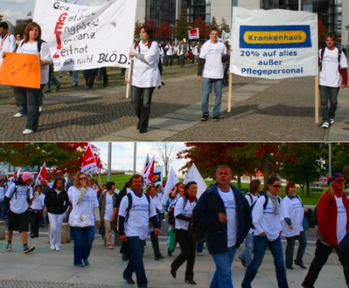 Mit selbst gestalteten Plakaten und Transparenten, die von den Pflegeschülern zum Brandenburger Tor getragen wurden, brachten die Krankenhausmitarbeiter aus dem Rhein-Neckar-Kreis ihren Unmut über die Sparpolitik der Bundesregierung zum Ausdruck.