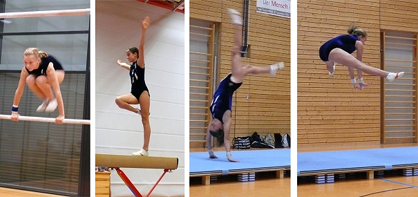 Zweiter erfolgreicher Wettkampf der Turnerinnen Alessa Sohns am Barren, Vanessa Gusic am Balken, Jule Mertes und Teresa Weis am Boden (v.l). (Foto: privat)(bro) (sf) Am vergangenen Freitag starteten die Turnerinnen des TVE in der KM IV, Gauklasse B, bereits in ihren zweiten Wettkampf der Herbstrunde. Diesmal mussten die Mädchen ihr Können gegen die Mannschaften aus Wieblingen und Nussloch unter Beweis stellen. Nachdem man sich bereits am ersten Gerät, dem Sprung, knapp vor der Mannschaft aus Nussloch einreihen konnte, war die Motivation für den restlichen Wettkampf sehr hoch. Besonders am Barren und Boden konnten die Turnerinnen mit ihren sicheren Übungen punkten. Insgesamt lieferten sich alle drei Mannschaften einen sehr spannenden Wettkampf, bei dem sich bis zum Ende keine ihrer Platzierung sicher sein konnte. Am Ende reichte es für die Mannschaft des TV Eberbach zu einem sicheren zweiten Platz mit nur knapp zwei Punkten hinter der Mannschaft aus Wieblingen. Erfreulich war außerdem, dass Jule Mertes in der Einzelwertung des Tages den zweiten und Teresa Weis den dritten Platz belegten.