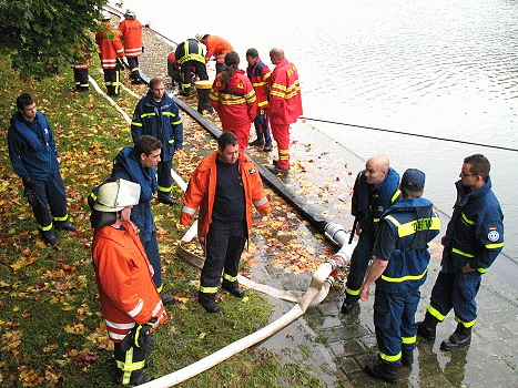 Nachdem die Tests zur Beseitigung von großen Mengen Schmutzwasser erfolgreich abgeschlossen waren, ging es zur nächsten Einheit. Die Freiwillige Feuerwehr aus Zwingenberg rückte mit einem Löschfahrzeug an. Gemeinsam mit den Kameraden vom THW testeten die Helfer daraufhin die Einspeisung von Löschwasser in das Fahrzeug. Nachdem dies geglückt war, wurde die Installation um eine weitere verbrennungsmotorbetriebene Löschwasserpumpe ergänzt und diese ebenfalls mit dem notwendigen Eingangsdruck versorgt. Unter Erhöhung des Drucks konnten die Feuerwehrmänner aus Zwingenberg mit ihrem Löschstrahl fast das gegenüberliegende Neckarufer erreichen. Solch eine Einspeisung kann bei einem Großbrand fern ab eines Gewässers notwendig werden, wenn zeitgleich eine große Menge Löschwasser benötigt wird.