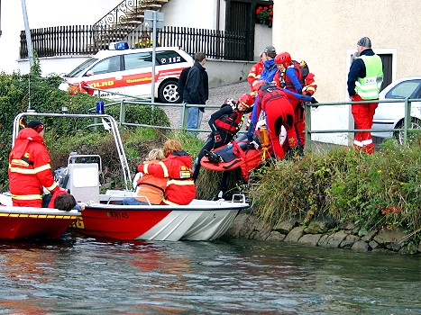 Wasserretter sind zu jeder Tages und Nacht Zeit einsatzbereit – so begann auch der erste Teil der Übung in der Dunkelheit. Gefordert waren die Bootsgruppen – auf schweizerischer Seite wurden beim Kraftwerk Rekingen die Boote ins Wasser gelassen und fuhren dann in Formation einige Kilometer stromaufwärts. Die Bootsführer mussten sich hierbei in der Dunkelheit und in dem unbekanntem Gewässer zurechtfinden. Um in der Übung einen möglichst realistischen Hintergrund zu haben, wurde folgendes Szenario gestellt: Eine Frau, offensichtlich in Panik geraten, kam hysterisch schreiend auf den Zugführer zugestürmt. "Mein Mann, mein Mann", flehte sie den Wasserretter um Hilfe an. Als Zugführer musste er sich zuerst einen Eindruck von dem gespielten Szenario verschaffen: Mehrere zum Teil schwerst verletzte Personen saßen und lagen in einem kleinen, vom Hochwasser bedrohten Areal. Zeitgleich mit ihm traf auch ein leitender Notarzt ein, der die medizinische Leitung bei dieser Übung übernahm. Gemeinsam sichteten sie Patienten und Betroffene, legten eine Behandlungs- und Transportreihenfolge fest und teilten die nachfolgenden Wasserretter ein. Mehrere Patienten, die nicht mehr gehen konnten, wurden auf speziellen Tragen für die Wasserrettung, sogenannte Spineboards, auf die Boote getragen und anschließend an einen sicheren Ort gebracht. Parallel dazu sicherten einige Kilometer stromabwärts Taucher einen durchweichten Deich. Hierzu rollten sie an der Wasserseite eine zehn Meter lange Folie aus. Unter Wasser beschwerten die Einsatztaucher die Ränder der Folie mit Sandsäcken. Eine körperlich anstrengende Arbeit für die im Wasser eingesetzten Kräfte, die nicht nur gegen die Folie, sondern auch gegen die Strömung des Rheins kämpfen mussten.