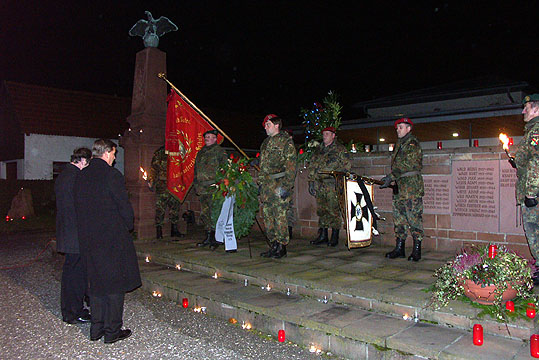 Reservisten hielten die Ehrenwache Bei der Gedenkfeier zum Volkstrauertag legten die Mitglieder der Reservistenkameradschaft Waldbrunn einen Kranz am Kriegerdenkmal nieder. Auch Ortsvorsteher Paul Scholl (2.v.l.) und Pfarrer Andreas Reibold (l.) gedachten der Opfer. (Foto: Thomas Baumgartner)(tb) Wie in vielen Städten und Gemeinden auch, wurde gestern, dem Vorabend des Volkstrauertages der Opfer von Weltkriegen, Gewalt und Terror gedacht. Bei Einbruch der Dunkelheit setzte sich ein kleiner Gedenkzug vom Strümpfelbrunner Rathaus zum Kriegerdenkmal am Strümpfelbrunner Friedhof in Gang. Angeführt wurde dieser von der Reservistenkameradschaft Waldbrunn, die später auch den Ehrenkranz zum Gedenken an die Opfer niederlegte.