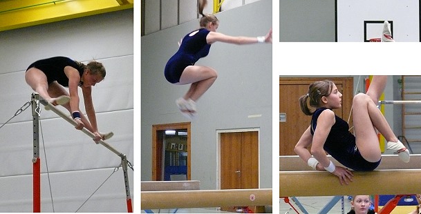 Am ersten Gerät, dem Sprung, mussten die Mädchen erstmal hintenan bleiben, dafür konnten sie aber gleich darauf am Barren ihren Rückstand mit den durchweg sicheren Übungen wieder ausgleichen. Der als "Zittergerät" bekannte Balken machte diesmal seinem Namen alle Ehre, alle drei Mannschaften mussten einige Abgänge, vor allem bei den akrobatischen Elementen wie Rolle oder Rad, in Kauf nehmen. So blieb es bis zum letzen Gerät, dem Boden, spannend. Hier zeigten die Mädchen ebenfalls gute Übungen und konnten sich am Ende des Wettkampfes über einen guten zweiten Platz hinter dem TV Dielheim freuen.