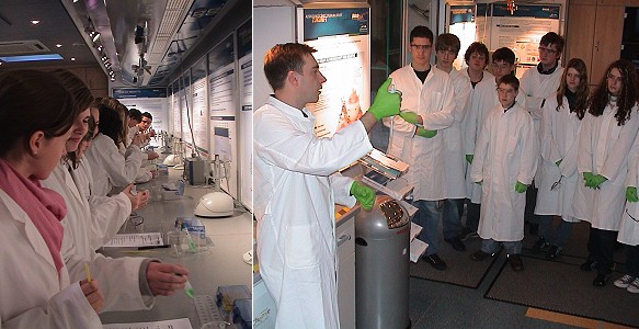 Für die Realschule in Eberbach setzte sich Helmut Höhn, Lehrer in den Fächern Physik, Chemie und Biologie, bereits vor etwa einem Jahr dafür ein, dass das BioLab an diese Schule kommt. Rund 60 Neuntklässler durften am vergangenen Freitag und heute unter der Leitung der Biologen Dr. Stephanie Würfl und Dr. Andreas Fehrenbacher in dem fast 17 Meter langen Fahrzeug an einem Praktikum teilnehmen. Auf rund 55 Quadratmetern Grundfläche befinden sich unter anderem eine Multimedia-PC-Einheit sowie ein S1-Genlabor. Bevor die Jugendlichen allerdings an die Arbeit gingen, wurde der theoretische Teil durchgeführt: Erklärungen, was ein BioLab ist, Sicherheitsbelehrungen, Erklärung der Werkzeuge waren nur einige Punkte. Der praktische Teil wurde ebenfalls sehr interessant, musste doch ein fiktiver Mordfall anhand von einer DNA-Analyse geklärt werden, die die Teilnehmer selbst erstellten.