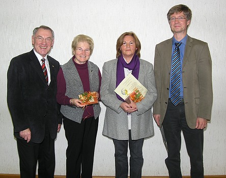 Ehrung von treuen Chormitgliedern Für zehn bzw. 50 Jahre Chorgesang wurden Angela Reinhard (2.v.l.) und Hildegard Frey geehrt, im Bild mit Günter Stanke (l.) und Bezirkskantor Godehard Weithoff. (Foto: Barbara Nolten-Casado)(bro) (bnc) In der Vorabendmesse zum Christkönigsfest kam die Katholische Kantorei St. Johannes Nepomuk am Samstag in der St. Josefskirche einmal mehr ihrem Auftrag nach, das Lob Gottes in der Musik zu verkünden. Und da am selben Tag mit Sankt Cäcilia die Schutzpatronin der Kirchenmusik ihren Namenstag feierte, trafen sich die Sängerinnen und Sänger im Anschluss zur traditionellen Cäcilienfeier in den Räumlichkeiten der Unterkirche.