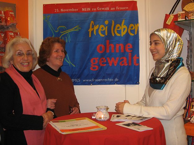 Frauenring und Weltladen gegen Gewalt an Frauen v.l.: Ana Marija Benzig und Gerda Pracht vom Frauenring Eberbach sowie Aynur Gider vom Eberbacher Lebens-Fluss. (Foto: Nicol Kolbe)(ko) Bereits zum zweiten Mal beteiligte sich der Eberbacher Frauenring zusammen mit dem Weltladen an der Aktion von Terre des Femmes „NEIN zu Gewalt an Frauen“. Im Mittelpunkt stand dieses Jahr die weibliche Genitalverstümmelung, die eine Menschenrechtsverletzung an Frauen darstellt.