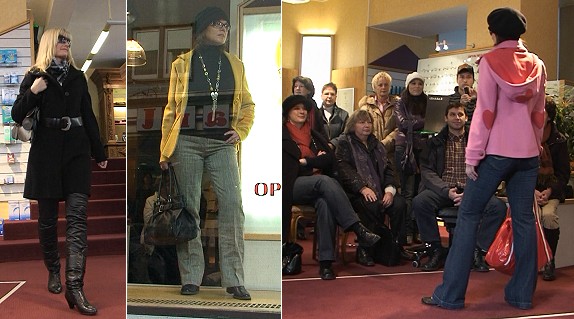 Die überwiegend weiblichen Eberbacher Models bewegten sich zur Moderation von Bernhard "Lungo" Walter gekonnt vor den Zuschauern vorbei und unternahmen sogar eine Tour durchs Schaufenster, so dass es für die Passanten auf der Straße auch etwas zu sehen gab. Gezeigt wurden aktuelle Modetrends sowie Accessoires und Brillen verschiedener Hersteller.