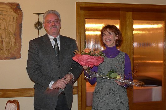 Das traditionelle Menu Anniversaire Mit einem Geschenk, Blumen und einem Dankeschön würdigte der erste Vorsitzende der "Freunde Thonons" Helmut Schultz das Engagement von Michèle Vetter in den kostenlosen vereinsinternen Sprachkursen. (Foto: privat)(bro) (rv) Zum traditionellen "Menu Anniversaire" trafen sich die "Freunde Thonons" vor wenigen Tagen in der Krone-Post, um als Freunde der französischen Kultur, zu der auch Gaumenfreuden gezählt werden, die Aktivitäten des zur Neige gegenden Jahres Revue passieren zu lassen.