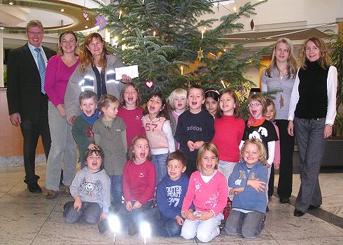 Sparkassenkundenhalle weihnachtlich geschmückt Die Kinder nach der Spendenübergabe vor dem geschmückten Weihnachtsbaum.(Foto: privat)(bro) (ng) "Es weihnachtet sehr" hieß es am Dienstag, 2. Dezember, in der Hauptstelle der Sparkasse Neckartal-Odenwald in Eberbach. Dieses Jahr schmückte der katholische Kindergarten St. Maria den Weihnachtsbaum in der Kundenhalle. Es kamen 15 Kinder zusammen mit ihren Erzieherinnen, die von Karlheinz Emig, Regionaldirektor, Nicole Wessely, Serviceleiterin, und Anna-Lena Kohler, Serviceberaterin Empfang, begrüßt wurden. Mit viel Freude schmückten die Kinder den Weihnachtsbaum mit ihrem selbst gebastelten Christbaumschmuck. Als Belohnung wurde dem Kindergarten eine Spende übergeben.