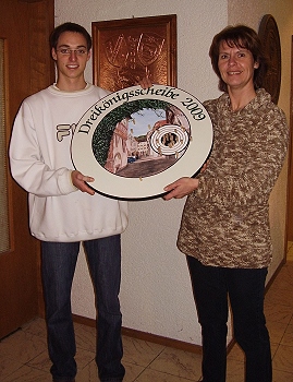 Stephan Schölch gewinnt 3-Königsscheibe (Foto: privat)(bro) (rj) Beim diesjährigen 3-Königsschießen der Eberbacher Schützen platzierte Stephan Schölch den besten Treffer. Traditionell wird hierbei nur ein einziger Schuss stehend mit dem Kleinkalibergewehr auf eine Distanz von 50m abgegeben, so dass oftmals auch weniger Geübte einen Glückstreffer landen können. In diesem Jahr aber spielte der Routinier sein Können aus und sicherte sich den Gewinn der handbemalten Scheibe, die ihm OSM Kerstin Liebsch anschließend überreichte.