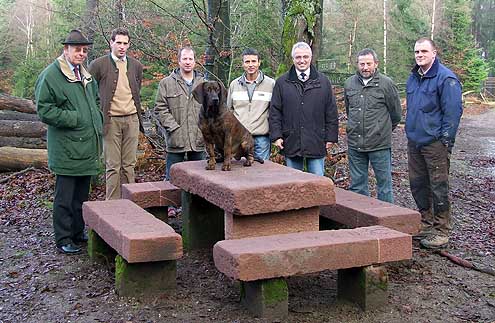 Sehenswürdigkeit auf der Max-Wilhelms-Höhe Unser Bild zeigt v.l. Prinz Ludwig von Baden, Prinz Berthold von Baden, Peter Walz, Bürgermeister Schölch, Ortsvorsteher Peter Ihrig und Andreas Kluss vom Markgräflichen Forstamt Zwingenberg. (Foto: Hofherr)(hof) Seit 1810 lädt der „Steinerne Tisch“ am Wanderweg von Mülben zum Jagdschloss „Max-Wilhelms-Höhe“ bzw. zum „Unteren Ferdinandsdorf“ Wanderer, Spaziergänger, Radfahrer und sonstige Waldbesucher zum Rasten ein. Durch umstürzende Bäume wurde der Tisch aus Buntsandstein stark beschädigt, sodass er nicht mehr genutzt werden konnte.