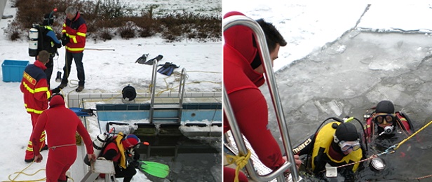 Die Stadt hatte bereits mit einer Kettensäge Quadrate frei geschnitten, um den Druck auf das Becken zu mindern. Diesen Einstieg nutzten die Taucher, um einen Rettungstauchgang unter einer geschlossenen Eisdecke zu simulieren. Versehen mit Lampe und Rettungsseil stiegen die Taucher unter die Eisfläche, wo eine Orientierung im dunklen, trüben Wasser nur mithilfe des Seiles möglich war.