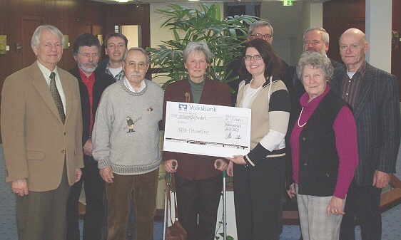 1.500 Euro für die Arbeit des NABU Die NABU-Verantwortlichen zusammen mit Abteilungsdirektor Hugo Sablowski (l.) und Marketingassistentin Sabine Heckel (5.v.r.). (Foto:privat)(tw) Abteilungsdirektor Hugo Sablowski und Marketingassistentin Sabine Heckel überreichten dieser Tage im Auftrag des Vorstandes der Volksbank Neckartal eG einen Spendenscheck über 1.500 Euro aus den Erlösen des Heimatkalenderverkaufs an die Verantwortlichen der sieben NABU-Ortsvereine im Geschäftsgebiet der Bank. Bei Kaffee und Kuchen wurde insbesondere die Frage diskutiert, wie die NABU-Vereine jugendliche Mitglieder gewinnen und für den Naturschutz begeistern können. Sablowski und Heckel informierten die Gäste über das Geschäftsjahr 2008 und die Verteilung des Spendenaufkommens im Rahmen der KulturUmweltSozialSponsoring – kurz KUSS – Konzeption der Bank. Im abgelaufenen Geschäftsjahr investierte die Bank rund 160.000 Euro zur Unterstützung von Schulen, Vereinen, Kindergärten, Kirchengemeinden und Kunst und Kultur.