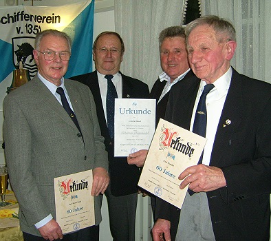Ehrenurkunden für treue Mitglieder V.l.: Karl-Heinz Emig, 1. Vorsitzende Helmut Raab, Cornelius Hauck und Karl Kinzler. (Foto: privat) (bro) (kw) Das Fischer-Gerichts-Protokollbuch von 1617 ist die älteste schriftliche Chronik, auf die der Schifferverein Eberbach zurückgreifen kann. "Erstlich ist von uralt hergebracht, dass jedes Jahr am ersten Dienstag nach St. Peter Stuhlfeyertag…." So beginnt unter diesem Datum der erste von 13 Paragraphen, die dort für den streng geregelten Ablauf des Fischergerichts, dem Vorläufer des Schiffertages, niedergelegt sind.