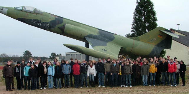 HSG-Schüler besuchen die Bundeswehr-Kaserne in Germersheim Die knapp 70 Schülerinnen und Schüler und ihre Lehrer unter einem ehemaligen „Starfighter“, der am Eingang des Kasernen-Areals steht. (Foto: privat)(mts) (pm) Im Rahmen des Gemeinschaftskundeunterrichts besuchten Anfang Februar 2009 die Klassen 9b und 10e von Studienassessor Dr. Christian Jung und die beiden Gemeinschaftskunde-Neigungskurse der Klasse 13 von Studienrätin Simone Jurk und Studiendirektorin Rotraud Cser die Bundeswehr-Kasernen der Luftwaffe in Germersheim. Zweck des Besuches war, die Bundeswehr als demokratische Institution den Schülerinnen und Schülern erfahrbar zu machen und zudem einen Einblick in den Alltag eines Soldaten zu ermöglichen.