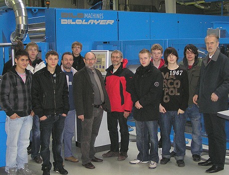 Zur Vertiefung der Eindrücke aus der Berufspraxis fand am Montag dieser Woche als Lehrgangsabschluss eine Betriebsbesichtigung bei der Firma Dilo statt. Nach einer interessanten Firmenpräsentation konnten Schüler und Fachlehrer im "Technikum" unter der Leitung von Karlheinz Walz und Paul Rohr die neuesten Maschinen zur Nadelvliesproduktion kennen lernen und den kompletten Produktionsprozess von der Faservorbereitung bis zum Endprodukt beobachten. Im Anschluss daran erfolgte ein Rundgang durch die Ausbildungswerkstatt. Nach der Führung wurde ein kleiner Imbiss gereicht und die Schüler hatten Gelegenheit, Fragen zu stellen, wovon reichlich Gebrauch gemacht wurde.