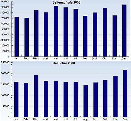 Januar bringt Zugriffszahlenrekord Die Zugriffszahlen 2008 auf dem EBERBACH-CHANNEL. (Repros: Hubert Richter)(hr) Der EBERBACH-CHANNEL startete mit einem Rekord ins Jahr 2009: Der Januar zeigte sich bei der Auswertung der Zugriffsstatistik als stärkster Monat seit Bestehen unseres Online-Magazins: Fast 1,1 Millionen einzelne Seiten haben unsere Leser an den ersten 31 Tagen des Jahres abgerufen, im Durchschnitt sind das knapp 35.000 Seitenabrufe täglich. Nahezu 227.000 Besucher sahen sich im Januar auf unserer Website um, das sind im Mittel mehr als 7.300 Besucher pro Tag.
