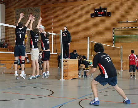 Im ersten Spiel in der Hohenstaufen-Halle in Eberbach gegen die durch Schneefälle verspäteten Pforzheimer ging es darum, die Halbfinalbegegnungen zu ermitteln. Da der Gegner den Eberbachern nicht wirklich gefährlich wurde, konnte man Kombinationen und verschiedene Aufstellungen ausprobieren. Man gewann souverän 25:8 und 25:13.