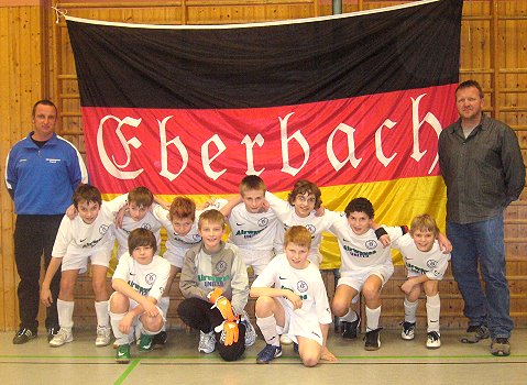 vorne: Christian Dietz, Justin Weinberg und Marvin Sauer, es fehlt Maxvalentin Laule, flankiert von den beiden Trainern Markus Maurovich und Thomas Weinberg. (Foto: privat)(bro) (bl) Am Samstag trat die D-Jugend des VfB Eberbach zum Endspieltag um die Hallenkreismeisterschaft in Wieblingen an. Als Glücksbringer hatte man im Gepäck die Fahne des Nationalmannschaftfanclubs "Eberbacher Jungs", die bereits bei der WM 2006 und EM 2008 bei den Spielen der deutschen Elf in den Stadien zum Einsatz kam. Ob es an der Fahne lag, dass ähnlich wie bei der DFB-Auswahl der großen Coup nicht gelingen sollte, ist aber eher unwahrscheinlich.