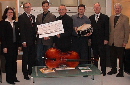 Unser Bild zeigt Herbert Hinterschitt (2.v.r.) und Ekkehard Saueressig (2.v.l.) mit Abteilungsdirektor Hugo Sablowski (r.) und Sabine Heckel (l.) von der Marketingabteilung der Volksbank bei der Scheckübergabe an die Musikschulleiter Frank Rinne, Tobias Soldner und Ralf Sutter (v.l.).