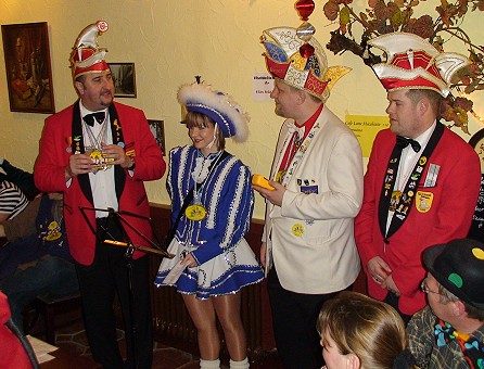 Die Origanisatoren der drei Eberbacher Karnevalvereine "Kuckuck", "Urmel" und "Eulenspiegel" sorgten unter Federführung von Bernhard Walter wieder für einen reibungslosen Ablauf der humoristischen Tour. Die Redner wurden in Begleitung ihrer jeweiligen närrischen Betreuer und Gardemädchen teils mit dem Kleinbus des VfB Eberbach von Lokal zu Lokal gebracht, wo im Halbstundentakt alle Gäste sämtliche Reden genießen durften - in unterschiedlicher Reihenfolge versteht sich. Jedes Jahr dabei sind bislang Otto Hildenbrand - diesmal als "Sportler des Jahres" - und Benni Müller, der seine Erlebnisse im Tanzkurs schilderte. Johann Bachl alias Taucher "Wastl" ging zum zweiten Mal mit auf Tour, und für Hans-Georg Hold als "städtischer Mitarbeiter" war gestern Premiere bei der "Tour de Bütt". Ebenfalls erstmals dabei war mit Sandra Dietz die einzige Frau der Runde, die von ihrem Vater, einem mehr oder weniger begnadeten Heimwerker, erzählte.