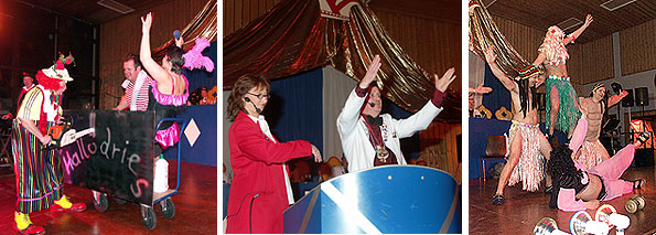 Den Schlusspunkt jeder Sitzung bildet die Bühnenshow der "Hallodries". Diesmal hatten sie sich das Thema Zirkus auf die Fahnen geheftet. Gleich war wieder Riesenstimmung, und die Truppe riss das begeisterte Publikum mit ihren Texten von den Stühlen. Natürlich durfte auch der "Fleeschworscht-Song", das Zwingenberger Fastnachtslied schlechthin, nicht fehlen. So brachten wieder einmal Silvia Mercks, Jasmin Fin, Hans Sarodnik, Herbert Mayer, Klaus-Jürgen Hansmann, Klaus Walter und Uwe Meinköhn die Stimmung im Schwanenhalspalast zum Kochen.