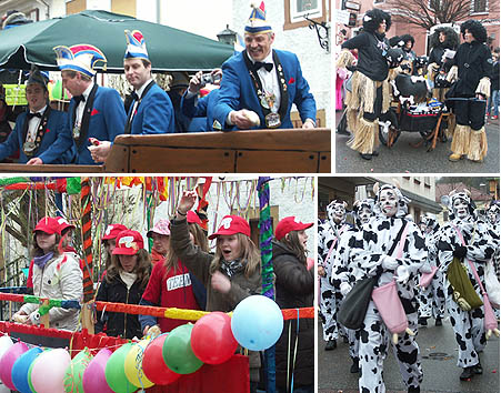 Viele Motivwagen und Fußgruppen beim Höhepunkt der Neckargeracher Fastnacht Trotz leichtem Nieselregen herrschte heute beim Neckargeracher Fastnachtsumzug Riesenstimmung. Unsere Fots zeigen u.a. den Motivwagen des NCV mit den "Teenies" und den