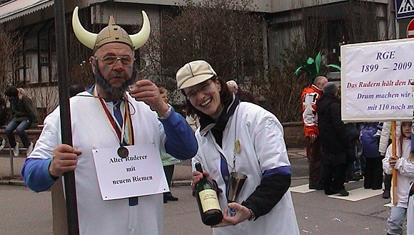 Bunte und lautstarke Narrenschar zog durch Eberbach Ein kleiner Umtrunk aufs 110-Jährige der Rudergesellschaft. (Foto: Claudia Richter)Mehr Bilder (Klicken zum Vergrößern):