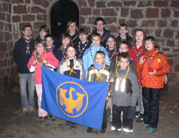 So zogen 20 Silberreiher am vergangenen Sonntag auf die Burg Eberbach. Als erstes liefen die Jüngeren mit ihren Gruppenführern los. Sie legten für die nachfolgenden Jungpfadfindergruppen eine Lichterspur auf die verschneiten Wege. Mit jedem Licht war eine der 10 Pfadfinderregeln verbunden, die die zukünftigen Pfadfinder beherzigen sollten. In der Schutzhütte bei der Burg wartete bereits ein prasselndes Feuer auf die Teilnehmer. Nachdem alle angekommen waren, wurde die Versprechensfeier mit einem Spiel zum Aufwärmen eröffnet. Es folgte ein traditionelles Pfadfinderlied mit Gitarrenspiel und Stammesführer Daniel Grab las die letzte Nachricht von Sir Robert Baden-Powell vor. Er selbst verlas diese Nachricht erstmalig auf dem ersten Worldjamboree 1920 in England. Er tat dies bereits 21 Jahre vor seinem Tod, aus Angst seine letzten Worte nicht rechtzeitig mitteilen zu können. In seiner letzten Nachricht ermahnte Baden-Powell seine Pfadfinder die Welt immer ein bisschen besser zurückzulassen, als diese sie vorgefunden haben.
