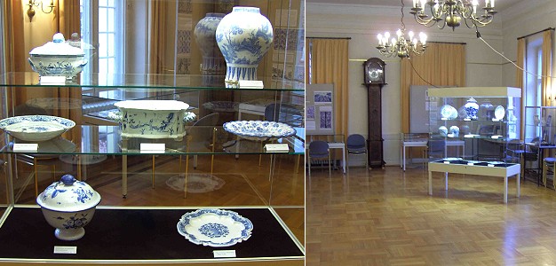 1661 nehmen in den Religionskämpfen zwischen Katholiken und Calvinisten ausgewanderte holländische Fayence-Meister die Arbeit in der ältesten deutschen Fayence-Werkstatt in Hanau auf und einige Jahre später in Frankfurt am Main. Es gelingen wunderschöne Einzelstücke in besonders qualitätvoller Blaumalerei, teils in chinesischem, teils in europäischem Dekor, die sich äußerlich kaum vom begehrten weißen Gold aus China unterschieden, wie man sich in der Ausstellung überzeugen kann. Die Fliesen, Vasen, die großen Teller, Buckel- und Fächerschüsseln und Enghalskrüge, um nur einiges aus der Produktionspalette zu nennen, finden bis heute wegen ihrer Schönheit und künstlerischen Ausstrahlung ihre Bewunderer. Erst lange nachdem es in Dresden gelungen ist, das Geheimnis der Porzellanherstellung zu lüften und zuerst in Meißen, später auch anderorts, u.a. in Frankenthal, die Produktion der oft noch chinesisch dekorierten Porzellanmanufakturen aufgenommen wird, kommt es schließlich auch in der Pfalz zur Gründung einer Fayencemanufaktur in Mosbach, die u.a. ebenfalls die typische blaue Strohblumenbemalung aufnimmt.