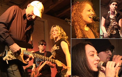 Heiße Rhythmen und starke Stimmen Linkes Bild: Gitarrist Hannes Solf, Bassmann Carsten Reiter und Sängerin Raluca Mihaela. Rechts oben Renee Walker und Saxofonistin Michelle Labonte. Unten Letizia und Dario Allegra. (Fotos: Hubert Richter)(hr) Eine gelungene Funk- und Soulparty starteten "Us2U" gestern Abend in der Galerie Artgerecht auf Einladung des Kulturlabors Eberbach. Die Band um den Gitarristen Hannes Solf hatte sich mit der Rockröhre Renee Walker als Gastsängerin eine brillante Verstärkung geholt. Aber auch sonst war es ein Abend der starken Stimmen: Raluca Mihaela sowie das Geschwisterpaar Dario und Letizia Allegra sorgten an den Mikrofonen für Vielfalt und knackig frische Interpretationen bekannter Songs wie Stevie Wonders "Superstition" oder Duffys "Mercy".