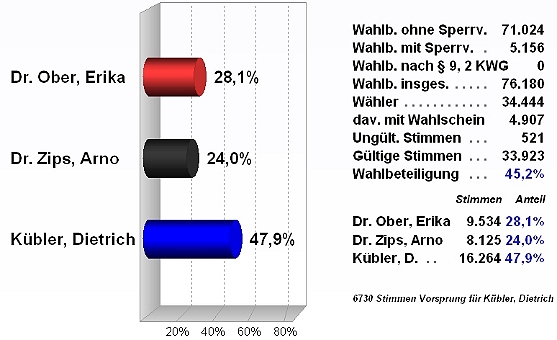 Kübler, 58-jähriger Land- und Forstwirtschaftsmeister aus Hüttenthal, erreichte 47,9 Prozent und deklassierte die Bewerber von CDU (Dr. Arno Zips, 24,0 Prozent) und SPD (Erika Ober, 28,1 Prozent) deutlich. Die Wahlbeteiligung lag nur bei 45 Prozent. Kübler hatte auch in Beerfelden (49,9 Prozent), Hesseneck (44,0 Prozent), Rothenberg (50,4 Prozent) und Sensbachtal (72,4 Prozent) die Nase vorn. Bei der Stichwahl stehen sich dann nur noch Kübler und Ober gegenüber.