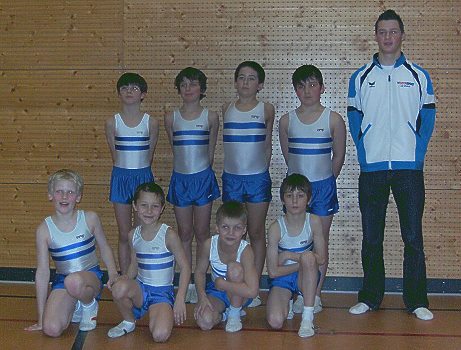 Zum ersten Mal starteten die Turner in der Bezirksklasse Die TVE-Geräteturner: Johannes Müller, Giulio Broghammer, Leon Höfler, Tim Dengel (hinten v. li.) ,Julian Kainz, David Brand, Benedikt Jung und Simon Richter (vorne v. li.) mit ihrem Trainer Alexander Seybold. (Foto: privat)(bro) (as) Am 6. März fand der Ligarunden-Endkampf im Geräteturnen der Bezirksliga Heidelberg statt. In Kirchheim trafen die B-Schüler Simon Richter, Benedikt Jung, Julian Kainz, David Brand, Johannes Müller, Leon Höfler, Tim Dengel und Giulio Broghammer des TV Eberbach auf die Mannschaften von SG Kirchheim I und II, TV Waibstadt und TV Eppingen.