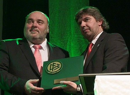 Rundes Fußballjubiläum im Neckartal Die Ehrentafel des Deutschen Fußballbundes (DFB) brachte Ronny Zimmermann vom Badischen Fußballverband mit (r.). (Foto: Hubert Richter)Mehr Bilder (Klicken zum Vergrößern):