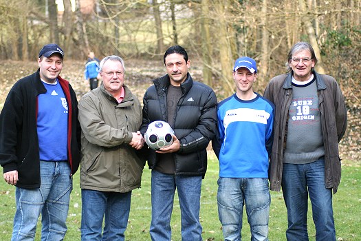 Ex-Vorstand Jürgen Waiz unterstützt weiterhin den Verein Die heutigen Vorstände Michael Gramlich und Michael Stark mit den Abteilungsleitern Fußball Karsten Uhrig und Jens Kloos bei der Übergabe durch Fahrschulinhaber Jürgen Waiz. (Foto: privat)(bro) (kh) Ein Dankeschön gilt dem im letzten Jahr ausgeschiedenen Vorstand Jürgen Waiz. Aufgrund eines beruflichen Neuanfangs stellte er bei den letzten Wahlen sein Amt zur Verfügung, mit dem Herzen bleibt er aber dem SV Zwingenberg treu. Dies bewies er beim ersten Heimspiel im neuen Jahr mit einer großzügigen Ballspende für die Abteilung Fußball.