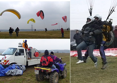 Per Seilwinde in luftige Höhen Reger Flugbetrieb herrschte heute auf dem Feld zwischen Schönbrunn und Haag. Links unten das Seilwindensystem mit Quad. Rechts hebt Bürgermeister Jan Frey (vorne) zum Tandemflug ab. (Fotos: Hubert Richter)