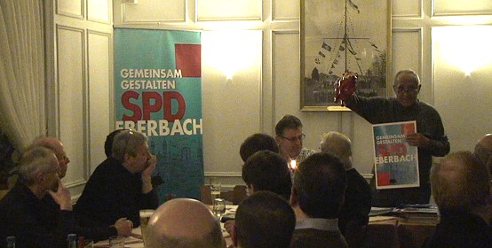 Liste für 7. Juni steht (Foto: Hubert Richter)(hr) Im Gasthaus "Grüner Baum" führte gestern Abend der Eberbacher SPD-Ortsverein die Nominierung der 22 Kandidatinnen und Kandidaten für die Gemeinderatswahl am 7. Juni durch. Bevor die anwesenden Parteimitglieder über jeden einzelnen Listenplatz abstimmten, stellte Vorsitzender Manfred Wernz das Werbematerial für den Wahlkampf vor (unser Bild). Bei der anschließenden geheimen Wahl wurden - wie vom Vorstand vorgeschlagen - die sieben amtierenden Stadtratsmitglieder auf die ersten Plätze gesetzt. Fraktionsvorsitzender Rolf Schieck führt die Liste an.