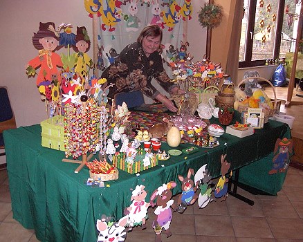 Ursula Gailing erfreut schon seit einigen Jahren ihre Kunden mit bayrischen Gletschersteinen, die sie mit sinnvollen Sprüchen bemalt. Am Stand von Isolde Klara konnte man Moosgummiarbeiten bewundern, immer wieder gern anzuschauen sind Liesel Wieders Gestecke aus Naturmaterialien, Rainer Köhler präsentierte zum dritten Mal seine Hasen- und Hühnerlaubsägearbeiten. Am Tisch von Hildegard Scheuermann und Elisabeth Mayer wurde man durch Gesticktes, Gestricktes und Gehäkeltes zum Kaufen angeregt, ebenso wie von den mundgeblasenen und handbemalten Eiern und Kugeln von Hansjörg Koch. Die weiteste Anreise hatten wohl Monika Scheuermann und Doris Müller, die mit ihrem Glasperlenschmuck extra aus Affolterbach kamen. Ellen Jehle ist auch künstlerisch sehr begabt und erfreute die Besucher mit ihren selbst gestalteten Figuren aus Tontöpfen. Bewunderung fanden auch die einzigartigen 3D Karten von Rita Zentler.