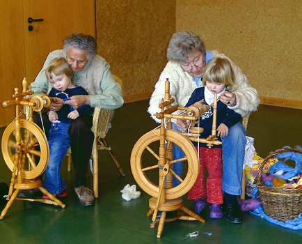 Vom Schaf zur Wolle (Foto: privat)(bro) (uw) Letzten Montag durften die Kinder des Kindergartens St.Maria ausprobieren, wie aus Rohwolle ein Faden entsteht. Christa Haas und Erika Backfisch vom Spinnzirkel stellten ihr Fachwissen, ihre Spinnräder und ihre Geduld zur Verfügung, um mit jedem Kind einen Faden zu spinnen.