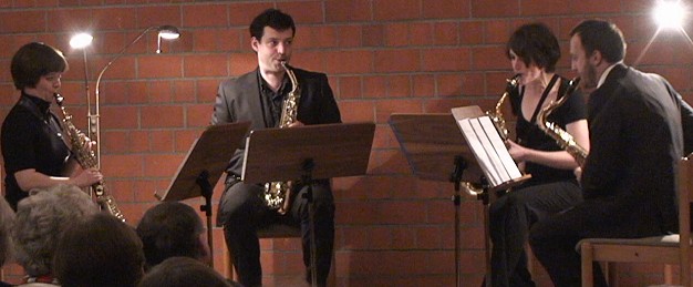 Ruth Velten (Sopransaxophon), Alexander Doroshkevich (Altsaxophon), Martin Posegga (Tenorsaxophon) und Annegret Schmiedl (Baritonsaxophon) widerlegten augenscheinlich und ohrenfällig mit ihren prachtvollen Instrumenten und ihrem virtuosen Musikantentum dabei auch den Werbeslogan des amerikanischen Marketingstrategen und Saxophonfabrikanten August Buescher, Saxophon sei ein Instrument “Easy to play - Easy to pay“, von dem vielleicht nur soviel richtig ist, dass das Instrument leicht zu erlernen scheint, aber es tatsächlich schwer bleibt, es richtig zu spielen.