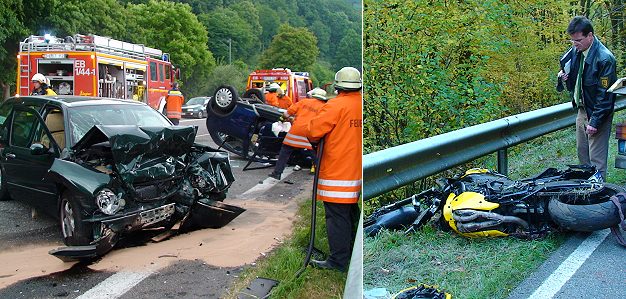Mehr Unfälle in 2008 - Verkehrsüberwachung und Prävention bleiben wichtig Zwei Unfälle mit Todesfolge in 2008: In dem grünen Lancia links wurde am 30. Mai ein Beifahrer so schwer verletzt, dass er einige Tage später verstarb. Der Fahrer der schweren Yamaha rechts erlag am 11. Oktober noch am Unfallort seinen Verletzungen. (Fotos: Archiv)(cr) Insgesamt 468 Verkehrsunfälle wurden im Jahr 2008 bei der Eberbacher Polizei aktenkundig. Die Zahl liegt geringfügig über dem fünfjährigen Durchschnitt. Im Jahr zuvor hatten die Eberbacher Beamten 452 Unfälle aufgenommen.