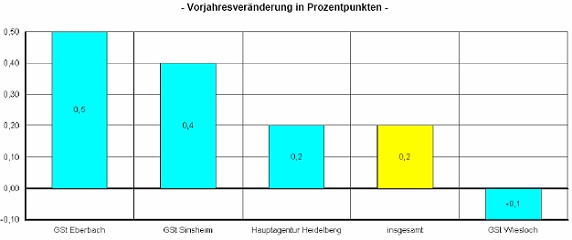 Arbeitslosigkeit steigt weiter In Eberbach ist die Arbeitslosenquote binnen Jahresfrist am stärksten gestiegen. (Grafik: Bundesagentur für Arbeit)(cr) (aa) Im März blieb die Arbeitslosenquote im Bereich der Heidelberger Arbeitsagentur unverändert bei 4,9 Prozent. Die Eberbacher Geschäftsstelle weist mit 5,3 Prozent eine nochmals leicht gestiegene Arbeitslosigkeit aus und liegt damit nur knapp hinter der Hauptagentur in Heidelberg (5,4 Prozent) an zweiter Stelle. 504 Menschen sind jetzt in Eberbach arbeitslos gemeldet, acht mehr als im Vormonat. Vor einem Jahr lag die Quote noch bei 4,8 Prozent, damals gab es 44 Arbeitslose weniger.